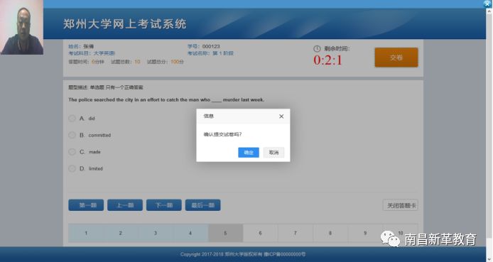 2、考试监控进入考试系统后,面部识别程序会全程监控考生行为,屏幕左上角为监控画面。如果考试过程中出现异常情况(不是本人,多张人脸,没有人)时,系统会给出相应提示,多次比对不通过的,系统会自动退出当前考试,本次考试作废。如图所示: