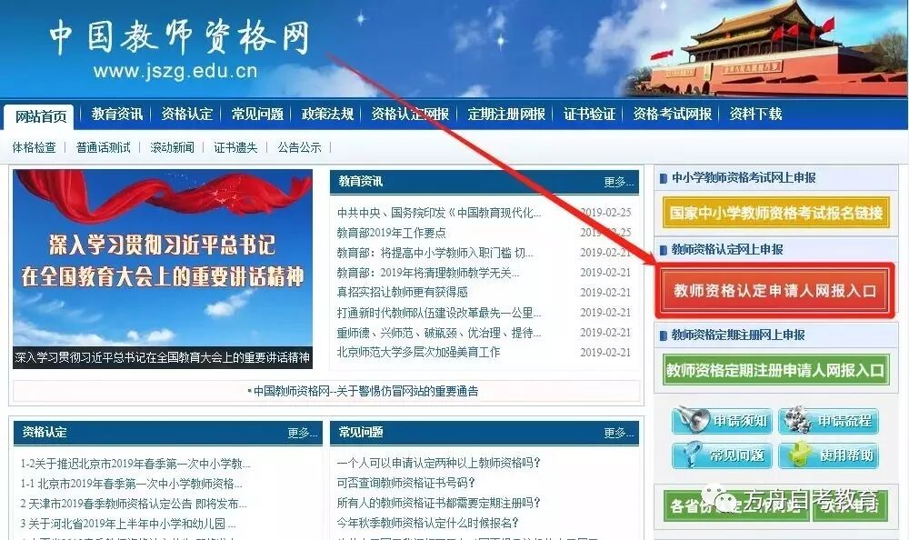 教师资格认定的流程大都需要经过网上申报-体检-现场确认-认定审批-证书发放领取等环节。 网上申报:申请人注册打印/体检、盖章现场确认:提交材料认定审批认定结束:发放证书 在提交材料为止,都是需要我们自己去做的,接下来我们就一步一步的来看我们需要做的事情吧! 在哪里进行网上申报,怎么申报 网上申报是在中国教师资格网 找到如图所示的入口 按照提示进行操作即可。 网址:http://www.jszg.edu.cn/portal/home/index 1 首先登录中国教师资格网 点击“教师资格认定网报入口”